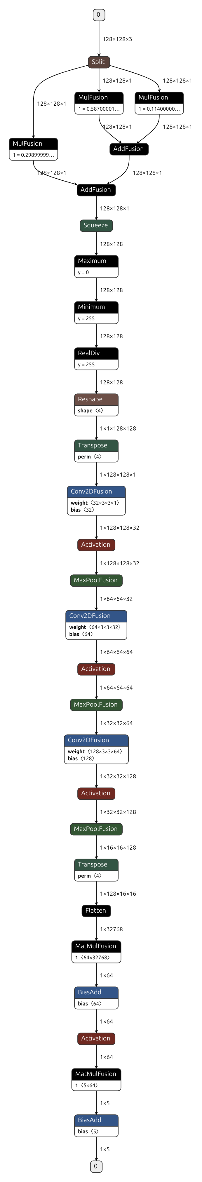 这里的AI模型是卷积神经网络(CNN)。CNN主要由卷积,池化,激活等算子组成; CNN模型架构如下表所示: